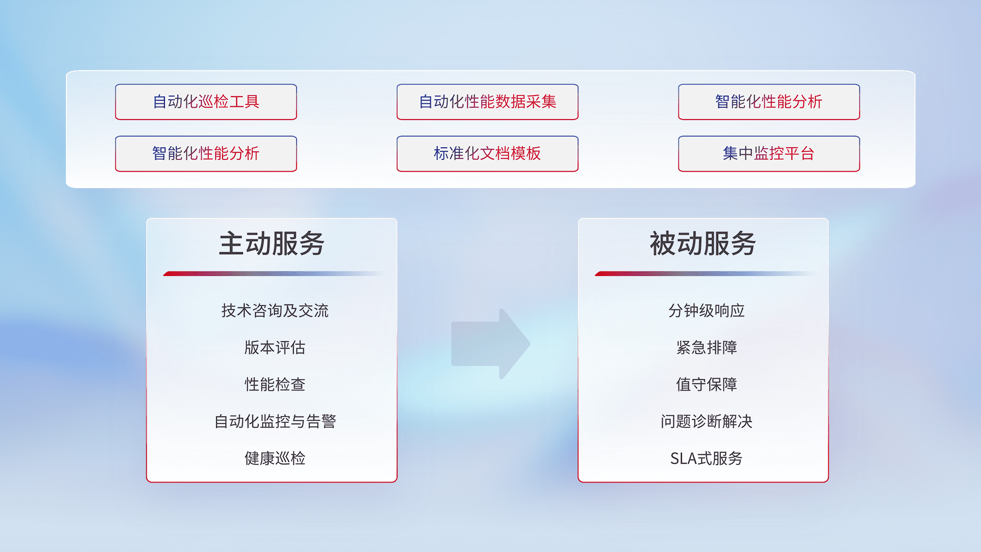 智能化工具和标准化文档,,,,保障服务质量,,,提供主动服务(包含技术咨询、、版本评估、、、性能检查、、自动化监控与告警、、、健康巡检)和被动服务包含(分钟级响应、、紧急排障、、、、值守保障、、问题诊断解决、、、SLA服务)。。